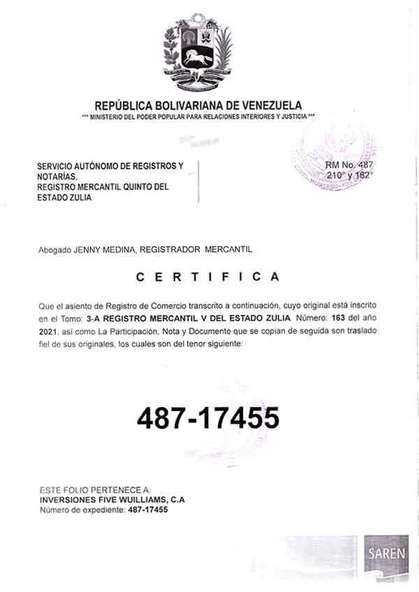 Publicación Registro de Comercio INVERSIONES FIVE WUILLIAMS CA